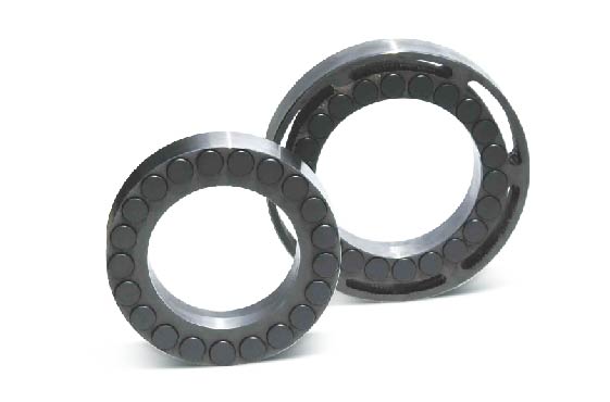 PDC軸承:適合于井下惡劣工況。試驗(yàn)結(jié)果表明,在開(kāi)式泥漿 潤(rùn)滑冷卻條件下,最高比壓達(dá)32MN/m,轉(zhuǎn)速400rev/min, PV值高達(dá)30MN/m·m/s時(shí),PDC止推軸承仍具有理想的磨擦系數(shù)和磨損壽命,可較好地應(yīng)用于井下動(dòng)力鉆具中。廣泛用于石油、礦山等部門(mén)的井下動(dòng)力鉆具